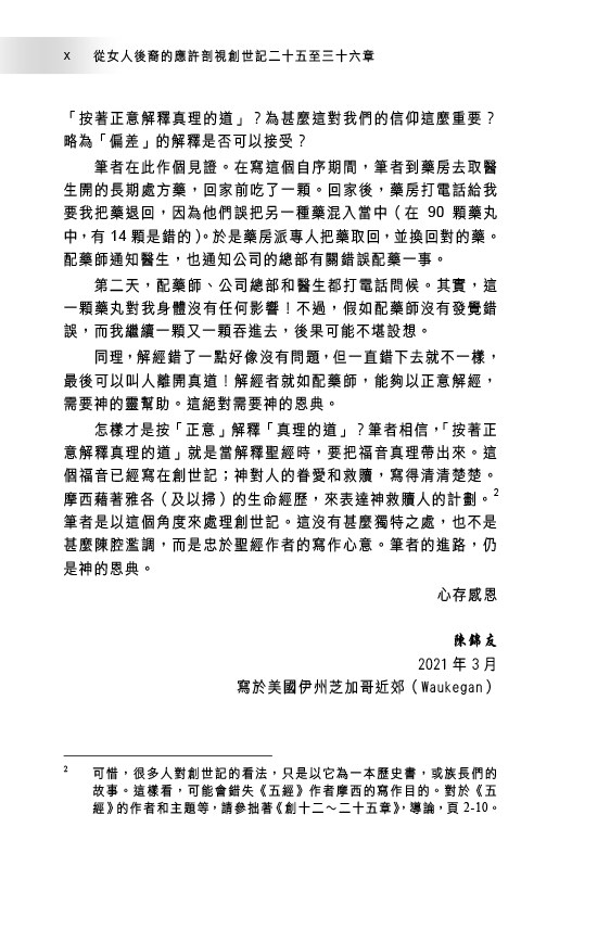 - 陳牧師的書一方面表達出他研讀聖經的深度,一方面關注聖經要給人的當代信息,而且皇皇加上應用以助讀者吸收和實踐,足見其牧者心腸。